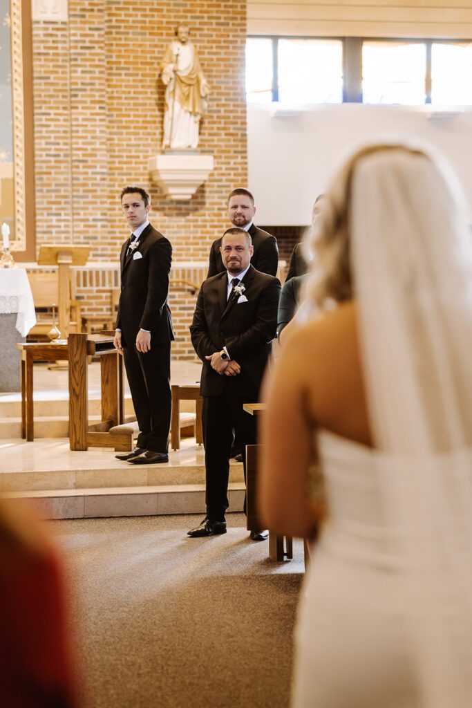 Emily & Jordan wanted their wedding to be a big party for all to enjoy – one that feels welcoming and like a good amount of thought was put into it but not super overdone and structured. They had their ceremony offsite at a church and then took a party bus during cocktail hour with their wedding party. They opted not to have a first look so they did the majority of their photos after the ceremony! After cocktail hour they headed to Brackett’s Cross Country Club for their reception! They opted for a band instead of a DJ which was a huge hit with their guests.